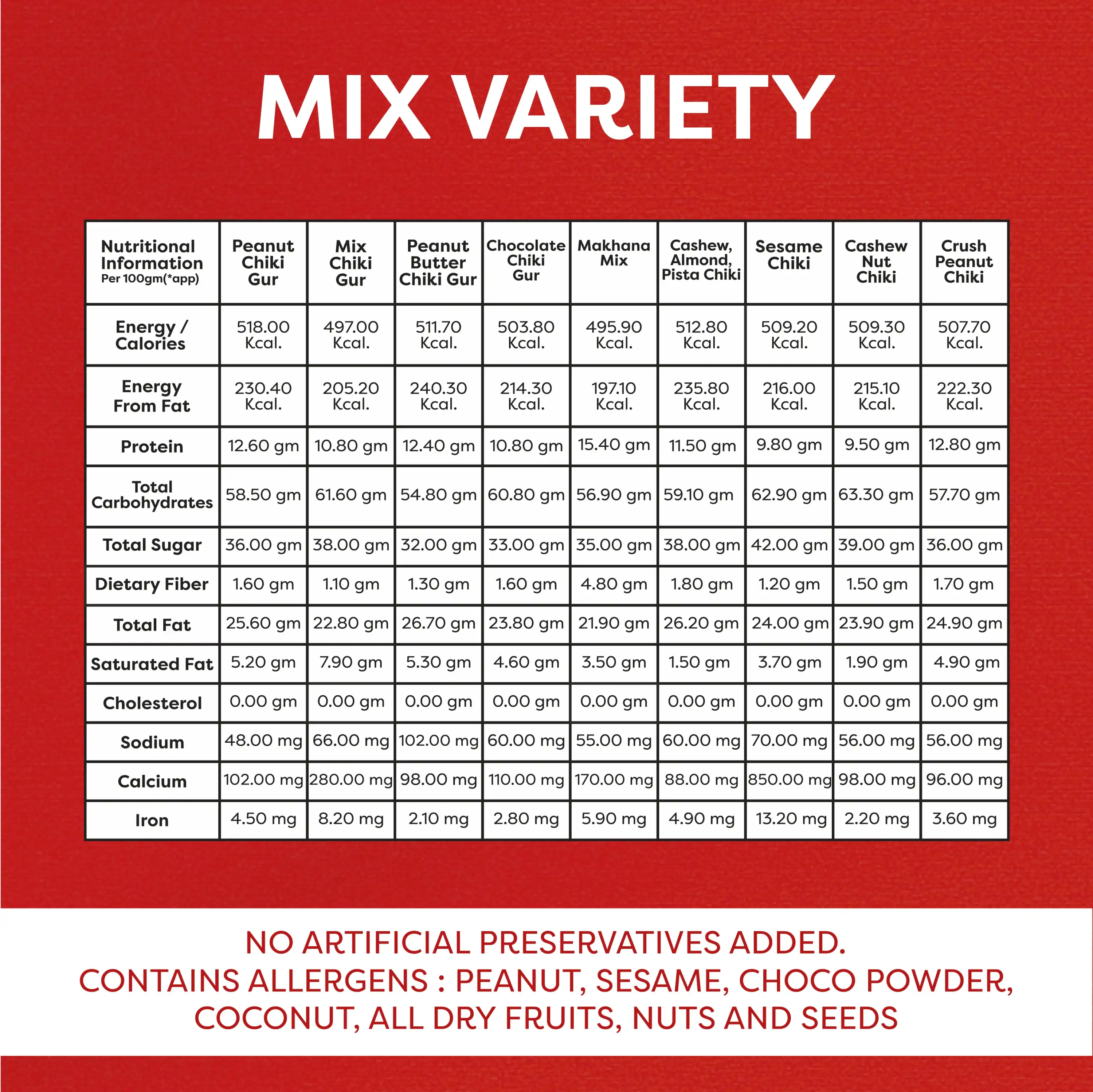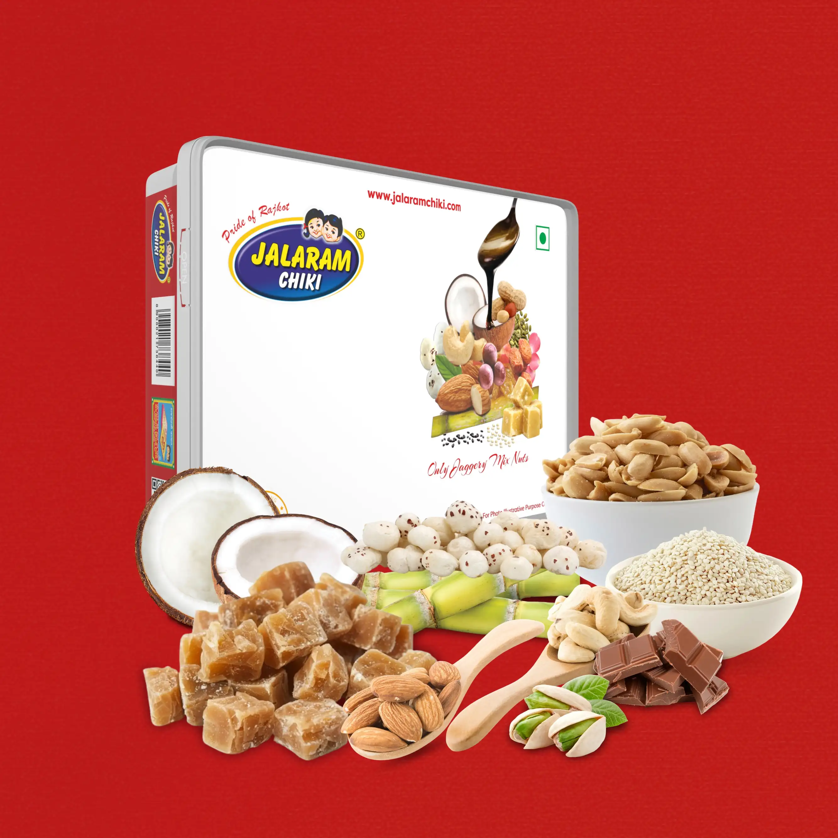Jaggery, Peanut, Sesame, Coconut, Black Sesame, Coco Powder,Dry Dates, Black Current, Resin, Rose Petals, Figs, Cashewnut, Almond, Pista & Liquid Glucose